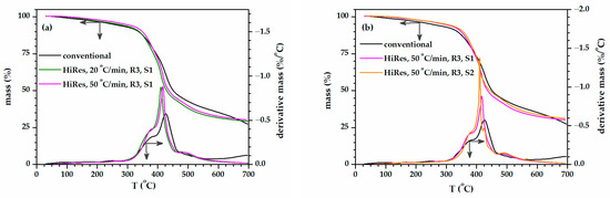 Given the fact that the HiRes TGA approach could distinguish very close degradation peaks, the question is whether a better separation of the main degradation steps from the range 350–450 °C is possible. As a preliminary requirement, the experimental conditions (constant heating rate, resolution, and sensitivity) should be suitably chosen, so that the experimental time may be comparable with that of the conventional TGA experiment. Otherwise, kinetic effects deem the conventional TGA and HiRes TGA results inadequate for comparative discussions. The constant heating rate is the value of the heating rate in the absence of degradation events. As the balance detects degradation, the heating rate was implicitly decreased until no degradation was sensed. According to our practice, resolution 3 is the most adequate for our samples to fulfill this essential. Figure 4a includes the results of conventional TGA (heating rate: 20 °C/min) and HiRes TGA (constant heating rates: 20 and 50 °C/min, R3, and S1) for the DGEBA-MIPA sample. The two peaks shifted to a lower temperature and intensified in the HiRes experiment, but their resolution was not improved. The use of two different constant heating rates did not produce an important change in the result. The modification of sensitivity from 1 to 2 (Figure 4b) increased the sharpness of the main peak, without an improved differentiation of the peaks in the main degradation stage. Nevertheless, unlike conventional TGA (Figure 3b), the HiRes experiment also marks the DGEBA-MIPA for the degradation of the aromatic cycles (around 500 °C).