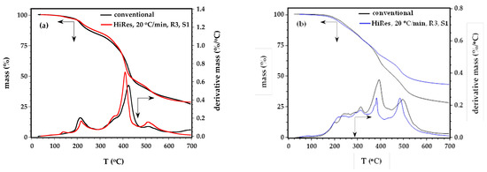 The thermogravimetric analyses of the samples were performed on a Discovery TGA 5500 (TA Instruments, New Castle, DE, USA). The tests were conducted by using three heating rate algorithms: constant heating rate (20 °C/min) and dynamic heating rate (HiRes TGA and modulated approach-MTGA), from ambient temperature to 700 °C. The HiRes TGA experiments were performed at resolution (R) 3 and sensitivity (S) 1 and 2, using the constant heating rates of 20 °C/min and 50 °C/min. The MTGA experiments were performed with 2 °C/min, a modulation amplitude of ±5 °C, and a period of 200 s.