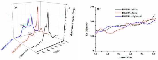 In the MTGA experiments (Figure 6a), the degradation steps discussed before were more obvious, including the rDA reaction. However, it is worth recalling that the heating rate was much lower (2 °C/min). The MTGA experiment lasted 340 min, as compared to 34 min (conventional TGA) and 47 min (HiRes TGA, R3, S1). The variation in the activation energy with the conversion, registered in real time, shows a peak at 0.15 conversion (DGEBA-Anth) due to the cleavage of the maleimide–anthracene adduct. Generally, it had an increasing trend with the conversion, with values between 100 and 200 kJ/mol.