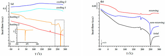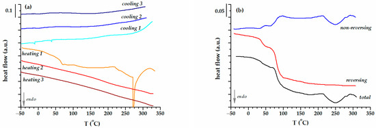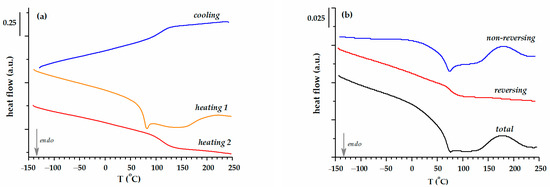 Differential scanning calorimetry (conventional—DSC and modulated—MDSC) was performed with a Discovery DSC 250 (TA Instruments, New Castle, DE, USA) under nitrogen atmosphere (50 mL/min). The heating–cooling–heating program with a heating rate of 20 °C/min was employed, unless otherwise specified. The MDSC analysis was carried out with 3 °C/min heating rate, modulation amplitude ±1 °C, and modulation period of 60 s.