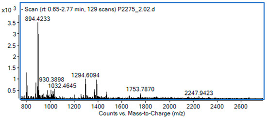 The data acquisition and analysis for the mass spectrometry (MS) were performed with an Agilent 6500 Series Accurate-Mass Quadrupole Time-of-Flight (Q-TOF) LC/MS instrument (Agilent Technologies, Santa Clara, CA, USA). The DGEBA-allyl-Anth dissolved in DMF:methanol (9:1, v/v) was introduced into the electrospray source (ESI) via a syringe pump at a flow rate of 0.02 mL/min. All spectra were acquired in the range m/z 100–3000, in negative ion mode (ESI-), with a source temperature of 325 °C and a capillary voltage of 4.2 kV. Nitrogen (N2) was used as the drying/nebulizer gas, at 35 psi and a flow rate of 8 L/min. The mass scale was calibrated using the standard calibration procedure and the compounds were provided by the manufacturer. Data were collected and processed using Mass Hunter Workstation Software Data Acquisition for 6200/6500 series, v. B.07.00 (Agilent Technologies, Inc., Santa Clara, CA, USA).
