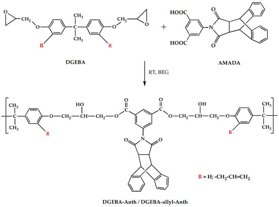 Maleic anhydride (99%), 5-aminoisophtalic acid (94%), diglycidyl ether of bisphenol A (DGEBA, epoxide equivalent weight 188 g·eq.−1), acetic acid, benzyltriethylammonium chloride (TEBAC, 99%), anthracene, methanol, N-methylpyrrolidone (NMP), ethylene glycol butyl ether (BEG), 2-methoxyethanol, and methanol were purchased from Sigma Aldrich, Darmstadt, Germany. All reactants and solvents were analytical grade and were used as received.