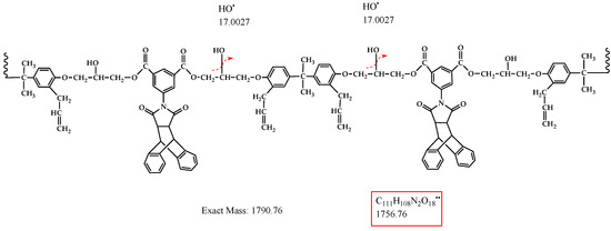 The ESI-MS allows for the direct analysis of sample solutions; however, the size of the peaks do not offer a quantitative evaluation of the data, but only qualitative [52,53]. The method was employed for compounds synthesized via Diels–Alder chemistry in order to track the progress of the transformation [54,55]. Nebhani and Barner-Kowollik investigated a diene–dienophile pair composed of anthracenyl capped polyethylene glycols and fullerenes [56]. Table 2 includes some of the species that were identified by means of mass spectrometry for the sample DGEBA-allyl-Anth (Figure 10).