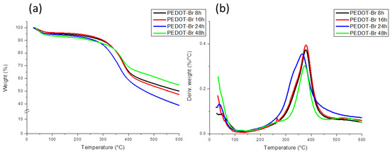 Thermogravimetric analysis of PEDOT-Br macroinitiators with different synthesis duration: (a) TG curves and (b) DTG curves of obtained products.