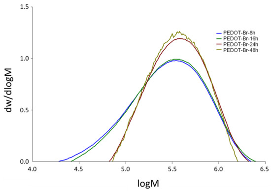From the values of molecular masses visible in Table 2, it can be concluded that an increase in synthesis time led to an increase in molecular masses. The numerical average ranged from 1.863 × 105 g mol−1 for the 8 h synthesis to 2.941 × 105 g mol−1 for the 24 h synthesis. After 48 h of synthesis there was no further increase in molecular mass and it remained on the same level as for 24 h. An explanation for this behavior could be that at molecular weights of about 2.90 × 105 to 2.95 × 105 g mol−1 the solubility limit of polymers in GPC analysis was reached and that all chains with higher molecular weights were insoluble. That this was indeed the solubility limit can be seen from the appearance of the curves shown in Figure 5 and was obvious when the solutions were prepared for analysis. The products from the 48 h synthesis were significantly less soluble than those from the 24 h synthesis, resulting in a much lower concentration in solution and therefore revealing noise on the curve for the 48 h synthesis. The dispersion of the samples, on the other hand, decreased with increasing synthesis time, from which it can be concluded that the polymer chains had more time to reach a similar length with longer synthesis time.