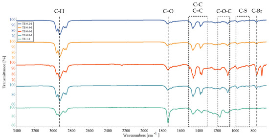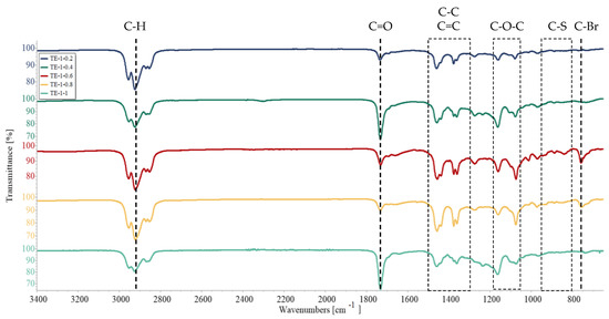 FTIR analysis was carried out for PEDOT ATRP macroinitiators obtained at different ThBr:EDOT ratios, and the results are presented in Figure 6 and Figure 7. The main difference between ThBr and EDOT monomer was the C-Br and C=O bonds present in ThBr, which were absent from EDOT. Therefore, the intensity of those bands should change correspondingly to the concentration of ThBr in the macroinitiator, being the strongest for samples TE 1:0.2 and TE 1:0.4. Nevertheless, this was not evident from the FTIR spectra. Based on the spectrograms in Figure 6 the characteristic bands were very similar for all samples, with the aforementioned bands’ intensity changing irregularly. Stretching of the C=O bond was strongest for samples TE 1:0.4 and TE 1:1, whereas the C-Br bond was strongest for samples TE 1:0.6 and TE 1:0.8. In the range of wavenumbers from 1500 cm−1 to 1300 cm−1, vibrations characteristic of the stretching of the C-C and C=C bonds in the thiophene ring were visible and the range of wavenumbers from 1200 cm−1 to 1000 cm−1 was attributed to the stretching of the C-O-C group, whereas the wavenumbers in the range from 900 cm−1 to 800 cm−1 were associated with the stretching of the C-S bond of the thiophene ring [34,35,36,37,38]. These bonds are common for both ThBr and EDOT, and therefore any change in intensity cannot be associated with the change in macroinitiator composition.