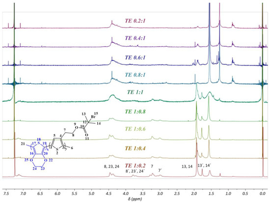 Figure 10 shows the 1H NMR spectra of all obtained PEDOT-Br macroinitiator products with different monomer ratios. To determine the real ratios and their difference from the ratio of monomers in the reaction setup, integrals of known protons belonging to specific groups of individual monomers were used (shown in the Supplementary Materials). For this purpose, a signal numbered 13 and 14 corresponding to the protons of two equal CH3 groups of the ThBr molecule and a signal numbered 8, 23, 24 corresponding to the protons present in the two CH2 groups of the EDOT molecule and one CH2 group of the ThBr molecule were used. If we assume that the integral of signal 13, 14 is equal to 6 because it corresponds to six protons from the two CH3 groups of the ThBr molecule, then we can easily determine the EDOT content in each sample from the magnitude of the integral of the signal labelled 8, 23, 24 [25]. Such a calculation yielded the ratios shown in Table 3. It can be seen that the ratios obtained agreed quite well with the original ratios, although it was obvious that a slightly higher proportion of EDOT monomers than specified was present in all samples. It can be concluded that EDOT reacts more readily and rapidly during polymerization than ThBr itself. In addition, the appearance of the double signals seen in all products with more ThBr monomer (TE 1:1–TE 1:0.2) and in the 1H NMR of PThBr (Figure S12) indicates that the aliphatic chains of the ThBr monomer were randomly oriented in space and that the polymers were atactic. The signal at 1.56 ppm could be assigned to water present in CDCl3, which is used as an NMR solvent [43].
