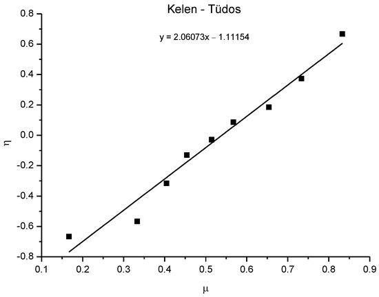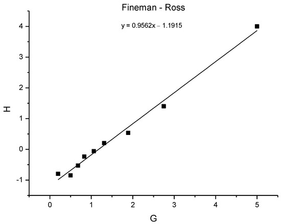 For additional confirmation of the results, the Kelen–Tüdos method [45] was performed (Figure 13). Using the H and G values obtained in the Fineman–Ross method, α, η, and µ were determined with the following equations to make a plot of η versus µ.