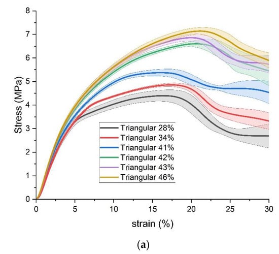 Firstly, the results of stress, strain, and appearance of standard specimens under the transverse compression load are compared by grouping them with the same infill pattern but different infill densities. The results with triangular, rectangular, and gyroid fills are shown in Figure 7, Figure 8 and Figure 9, respectively. In the plots of stress versus strain, the thick lines illustrate the average results from each group of five specimens with the same 3D printing parameters, and the corresponding shadows are the value ranges of the average plus/minus one standard deviation. Based on the aforementioned average results, the compressive yield strength is estimated by the method of 0.2% offset. In addition, the typical appearances of specimens are compared at three strain points, which are the strain points when the average offset compressive yield strength happened, the strain points when the average ultimate compressive strength happened, and the strain points of 30%.
