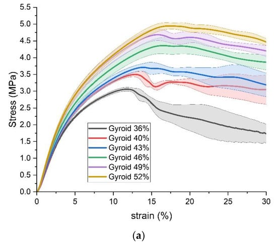In the group with non-solid fills, the strain points when the ultimate compressive strength happens show a gradually increasing trend with the increase in infill density, which can support the above analysis. Because of the increase in infill density, the space in each layer becomes smaller, which makes the falling of upper-layer material more difficult. Meanwhile, due to the structure of the solid fill, there is almost no space for the falling of upper-layer material. Therefore, the ultimate compressive strength does not show on the stress-strain curve of specimens with the solid fill, even at 30% strain. In addition, for the three non-solid fills, after the ultimate compressive strength is reached, the compressive strength reduces with further increasing strain. However, the degree of reduction with the gyroid fill is smaller than with the other two patterns, which may be caused by the broken inside structures generating new supports for each other during the failure.