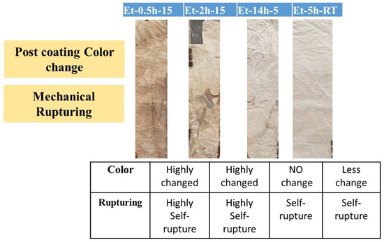 General images of the coated cotton processed under various conditions were taken and compared with the uncoated cotton fabric, as shown in Figure 1. The images were taken after completion of all steps, including coating, drying, curing, and then washing. Various conditions of the coating preparation and then post-coating conditions can be seen in Table 1. The typical images not only show color difference imparted to the cotton fabric during the coating process, but also the intensity and degree of self-rupturing of the cotton fabric due to the treatment process. It can be seen that the cotton heated for a long time, as shown in ET–0.5h–15 (15 h heating), ET–2h–15 (15 h heating) has a high degree of color difference and self-rupturing compared to the other samples. The inset table in Figure 1 shows the level of rupturing in all the coated fabric. Broken patches and parts caused by the self-rupturing can be easily seen in the images in ET–0.5h–15, ET–2h–15, suggesting the coated process has severely danged the cotton fabric to the extent that it could not afford shaking or transference from one place to other. Thus, in terms of initial practical observation, the condition is not feasible for the objective application of these coatings. In addition, it can be seen that as well as the self-rupturing, the colors of the cotton have been changed to a higher degree from initial un-coated fabric. It is believed that due to a longer duration of heating, the presence of acidic molecules was responsible for such adverse changes in the originality of the cotton fabric. As the heating time decreased from 15 h to 5 and 0 h, the cotton fabric regained its original color and ability to withstand self-rupturing. The heating process could cause the acidic and silica network to react in such a manner, possibly causing an exothermic reaction in the presence of a high-heat futile environment, and thus, it could damage the cellulosic network of the cotton fabric, as can be seen in the initial two samples. However, as the heating time has been reduced, the level of exothermic reaction and effects were reduced, and thus less color change and rupturing were observed.