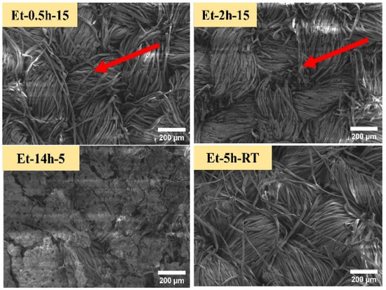 The coated cotton samples were than observed through low-voltage scanning electron microscopy, as shown in Figure 2. Since the cotton fabric is cellulosic in nature, which is a green molecule that contains a combination of oxygen and carbon molecules, and thus, the high voltage can damage these molecular networks. The low-voltage SEM was able to observe the micro-details of the coatings deposited on the cotton fabric at the individual fiber level. From the SEM images, it can be seen that similar to macro-images, as discussed earlier, the rupturing process penetrated to the singular fibers. A portion of fibers can be seen as broken and torn apart, as shown in ET–0.5h–15, ET–2h–15. In addition, it can that the coating deposition performed uniformly on all the individual fibers, and thus covered the entire fabric matrix. Further, it can be seen that the coating process could not change the original and compact nature of the cotton fabric, and thus, the design and pattern of the cotton fabric is still in place, as found in the control cotton fabric. Coating microstructure found on ET–14h–5, ET–5h–RT can be seen as different compared to the initial two conditions. In case of ET–14h–5, the surface is completely covered, and thus the individual fabric cannot be seen clearly, while in the case of ET–5h–RT, the surface is compact and has no broken portions or parts, as found earlier, confirming the lesser extent of rupturing. Further, the original pattern of the fabric was found to be intact and compact. Surface morphology and microstructure as observed in the SEM can be helpful to discuss the results obtained in the next experiments.