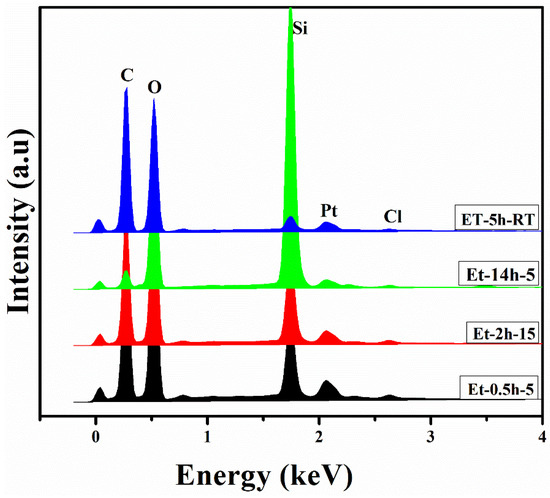 To determine the compositional profile of the coatings deposited on the cotton fabric, EDS analysis was carried out and the elemental profiles for each coating were drawn as shown in Figure 3. It can be seen that C, O, Si, Pt, and Cl were obtained in the elemental profiles. C and O were obtained from the ethanol and cotton fabric, while the Si was obtained from the TEOS. Pt was obtained from the Pt sputtering, carried out before the SEM and EDS measurement to facilitate conductivity of the coated fabric. Si was obtained from the TEOS and Cl was obtained from the HCl. N was deposited in a lesser amount from the precursors and thus could not be found in the elemental profiles. The presence of an excessive amount of Si suggests the successful deposition of the Sol–gel to the individual fiber, and thus could help to protect the coated fabric against fire.