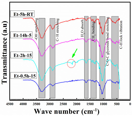 The FTIR analysis, which is used to explore the molecular composition of the coated species, can be seen in Figure 4. The obtained peaks in the FTIR profile can be attributed to various stretching and vibrational modes of the bonds between these species. Major stretching and vibrational modes were recorded as follows: OH stretching, CH stretching, H2O absorption, CH absorption, CH2 bending, C–O–C glycoside bend stretching and C–H rock vibration. The OH and CH stretching were obtained at above 2500 cm−1 wave number, suggesting lower energies for these resonations. It is believed that these vibrations have been caused by the C–H and O–H present in the ethanol and cotton fabric. Further, it can be seen that width of these two peaks has been altered significantly with coating conditions, suggesting OH is removed by a longer heating process. It is important to note that the peak shift and modification obtained at 1200 and 1135 cm−1 can be attributed to the stretching of the –Si–O– cellulose and –Si–O–Si– bonds, which suggests the successful deposition of the coating layers.