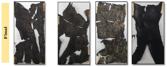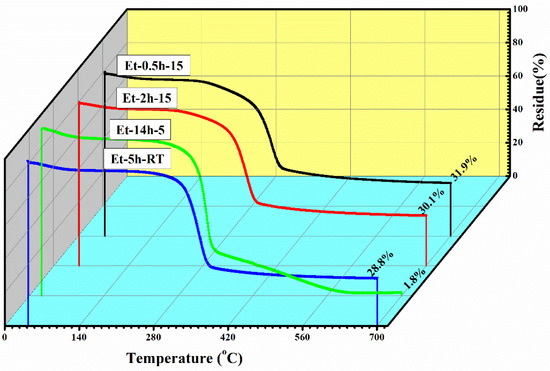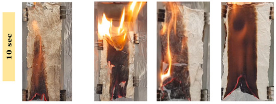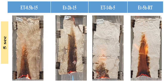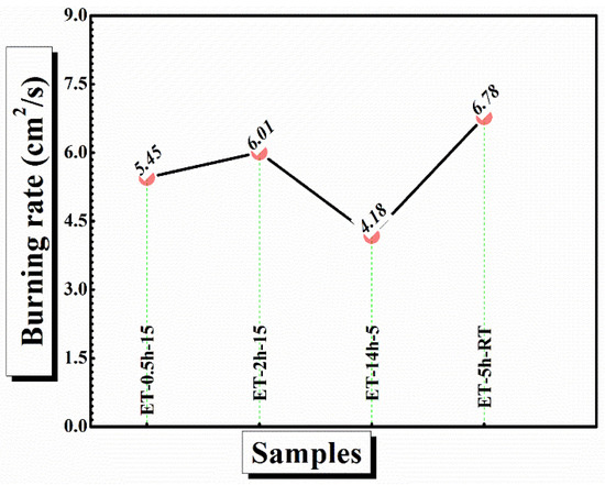 In case of ET–0.5h–15 and ET–2h–15, the char has been completely broken into parts and could not withstand alone, suggesting strain in the cotton matrix and conversion of the maximum portion of the char into ash. In comparison, the ET–5h–5 and ET–14h–RT can be seen as mechanically stable and thus could play a role to block the transfer of flame from one place to other, which could not be the case if the cotton broke into pieces and was thrown into a new area of flame-less zone [48]. Finally, the burning rate of the coatings was calculated from the VFT experiment as shown in Figure 10. The lowest burning rate was obtained as 4.1 cm2/s for ET–5h–5, which is quite a bit lower than the values obtained for other samples.