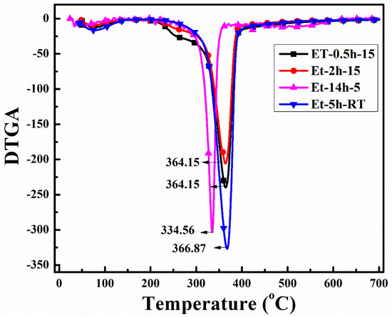 DTGA analysis curves of the coated fabrics obtained under various conditions.