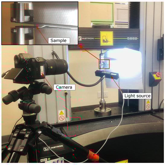 To characterize mode I toughness for the toughened adhesive tapes, DCB tests were performed following the ASTM D5528-13 standard. Figure 2 shows the experimental test setup performed using a universal testing machine (Instron 2885) at 1 mm/min loading rate. Samples were loaded through aluminum blocks that were bonded to the adherends using Araldite A/B adhesive. A high-resolution camera captured real time crack propagation and damage modes during the testing. Four samples were tested for each batch and the average toughness was computed.