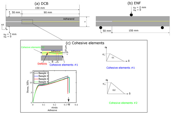 Two-dimensional models: (a) double cantilever beam (DCB), (b) end notch flexural (ENF) tests for bonded joints with thermoplastic adhesive tapes incorporating tailored defects, and (c) the cohesive interfaces and tailored defect details with tape’s stress–strain response.