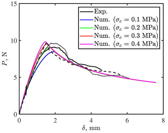 To determine the interfacial strength, we run the developed FE model with different values of until achieving best fitting with experimental results as shown in Figure 4. Best fit interfacial strength was = 0.2 MPa. To characterize the cohesive properties of the cohesive elements , we glued thermoplastic tapes to adherends using Araldite 420 A/B adhesive, which has higher toughness than the thermoplastic tape. We then bonded the adherends already pre-equipped with thermoplastic tapes to ensure crack prorogation at the interface between the two adhesive sublayers (interface ). Thus, the calculated toughness was = 0.045 N/mm. We followed the same procedure as for to obtain optimized interfacial strength for this interface = 0.5 MPa.
