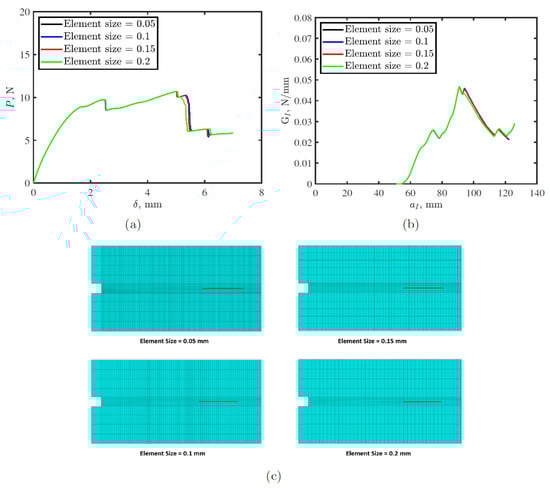 Mesh sensitivity analysis for double cantilever beam (DCB) tests on toughened thermoplastic adhesive tape with 2 mm sacrificial defect and 5 mm gap: (a) load-displacement (P-) response; (b) fracture toughness, -crack length, response (R-curve); and (c) meshes with different element sizes. the red lines in c represent the defects.