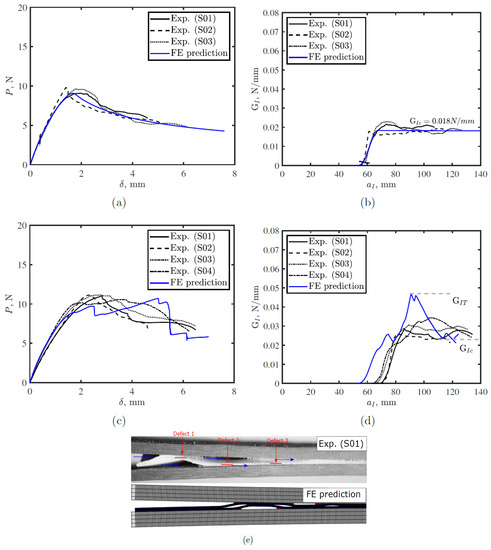 Figure 6 shows a comparison between the model prediction and DCB test results for conventional and toughened tapes with a 2 mm defect size and a 5 mm gap between defects. Figure 6a,b confirm fair agreement between the proposed model predictions and experimental measurements for conventional tape. For conventional tape, the initiation toughness of S01 and S02 was slightly higher than the FE model predictions because during our experiments we did not create a pre-crack at any of the interfaces. So, the initiation of the crack requires quite large energy to localize the stresses at one of the interfaces and then crack initiate at this interface. However, in the FE model, we presented the first cohesive element at the upper interface with weak cohesive element properties to initiate the crack at this interface and to avoid convergence issues. After the crack initiates, it propagates until the critical fracture toughness = 0.018 N/mm is reached. For the toughened tape, the model showed qualitative agreement with the experimental results. Since the PTFE locations are not as precise as those in the numerical model, and the viscosity of the thermoplastic adhesive, it is difficult to achieve perfect agreement with the experimental responses. It is even unrealistic to obtain identical experimental curves due to those variations. In the experiments, crack migrates to the lower adhesive–adherend interface at the first defect; whereas in the FE model prediction, the crack propagates at the upper interface after the first defect and migrates to the lower adhesive–adherend interface at the second defect. This is because the offset for the first crack was at the upper interface in the simulation, which inhibited crack migration at that defect. However, the crack migrates to the lower adhesive–adherend interface at the second defect, which was observed experimentally. The difference in the damage modes results in improved toughness to around 0.028 N/mm compared with 0.018 N/mm for the conventional tapes. The FE model is to capture the major failure mechanism and to help to better design the strategy. Here in Figure 6e, the FE model successfully reproduced the fracture mechanism found in experimental tests, that is the bridging ligaments due to the PTFE defects. Two main points were marked in the R-curve of the toughened tape (see Figure 6d), and , which represent total energy in the system at this instant and the critical fracture energy, respectively. The difference between them is elastic energy stored in the system during propagation, associated with the presence of defects. Hence, treating both points should be done with caution for real structures, where can not be considered critical fracture toughness for the system since toughness reduced to almost half once the crack passed this point. The reason for this reduction is explained further in Section 4.