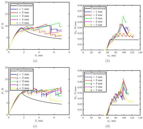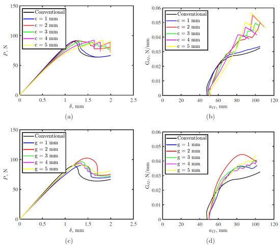 End notch flexural (ENF) simulation crack width, c, and gap between two successive cracks, g, effects on, (a,c) load-displacement; and (b,d) R-curve, respectively.