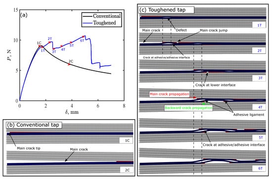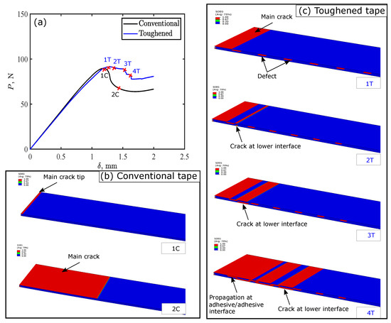 Figure 9 shows toughening mechanisms for thermoplastic adhesive tape with c = 2 mm and g = 5 mm under DCB simulation. The figure shows the load-displacement curves for conventional and toughened tapes and the simulated crack growth at different stages of loading. Conventional tape exhibits typical crack propagation for DCB test, where the crack initiated at the upper adhesive–adherend interface and propagated along the same interface. In this case, load-displacement response is characterized by elastic load increase until the energy release rate exceeds the interface critical fracture toughness, then a crack initiates at the upper adhesive–adherend interface corresponding to point “1C” in Figure 9a. When this crack initiated, the load decreased while the crack propagates at the same interface as shown in Figure 9b, which is a typical response of DCB joints [20,28].