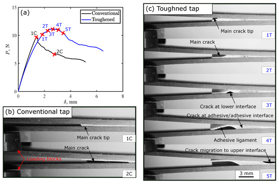 Experimental evolution of toughening mechanisms in thermoplastic adhesive tapes with 2 mm crack length and 5 mm gap between cracks: (a) load-displacement curves for DCB test; and crack propagation in (b) conventional tape, and (c) toughened tape.