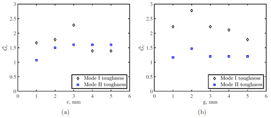 Figure 12 shows the effect of toughened thermoplastic adhesive microstructure on mode I and II toughness based on FE simulations, where represents normalized toughness for toughened tape with respect to conventional tape. Both c and g influence mode I and II toughness improvement. Increasing c improves mode I and II toughness up to a certain limit. For the tape with g = 5 mm, the maximum mode I and II toughness improvement was achieved for c = 3 mm, where the mode I and II toughness improvement equal 227% and 160% conventional tape toughness, respectively. Further increasing c reduced the improvement of mode I toughness and stabilized the improvement rate in mode II toughness. Considering the toughening modes presented in Section 4.1, where the main crack propagates at the upper skin–adhesive interface, a backward crack propagates at the lower skin–adhesive interface, and a crack at the adhesive–adhesive interface, the relation between toughness increase and the crack length can be explained. Increasing c up to 3 mm, the backward crack propagation increases, while the length available for the adhesive–adhesive crack decreases. Despite this decrease in the propagation length at the adhesive–adhesive crack, the backward crack prorogation is larger, which globally enhances the toughness. Further increasing c more than 3 mm, the toughness reduction due to the reduction in the length available for the adhesive–adhesive crack became more significant which results in global toughness reduction. However, the toughness still is larger than the toughness of the baseline tape. For the tape with c = 2 mm, the maximum mode I and II toughness improvement was achieved for g = 2 mm, where the mode I and II toughness toughness equal 278% and 147% conventional tape toughness.