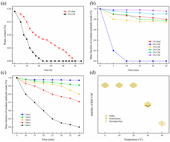 According to the results of water retention experiments in CSF and BAC (Figure 2a), the sand becomes dehydrated over time. BAC-treated sand had a higher water content than CSF-treated sand throughout the experiment, and the sand treated with CSF was nearly dry after about 20 h, whereas BAC-treated sand was completely dry after 50 h. As a result, BAC showed superior water retention properties over CSF. As shown in Figure 2b, as a widely used sand-fixing material, CSF’s anti-water erosion ability increased with concentration. The water retention performance of sandy soil treated with BAC at 3% concentration is comparable to that of sandy soil treated with CSF at 2–3% concentration, indicating that BAC has good water erosion resistance. It is illustrated in Figure 2c that BAC achieved a sand fixation rate of more than 70% at wind speeds of 12, 14, 16 and 18 m/s. At a wind speed of 20 m/s, BAC still had a sand-fixing effect of 40%, demonstrating the material’s anti-wind erosion properties. Figure 2d shows that the BAC has good stability below 20 °C, delamination occurs at 30 °C, and decomposition occurs at 40 °C.