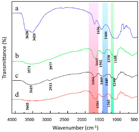 FTIR spectra: (a) APT; (b) APT−starch−lignin; (c) PAM−APT−lignin; and (d) PAM−APT−starch−lignin.