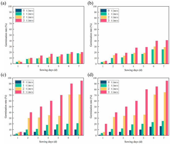 Effects of irrigation times and treatment methods on the germination rate of sandy soil: (a) Blank; (b) CSF; (c) BSF; and (d) BAC.