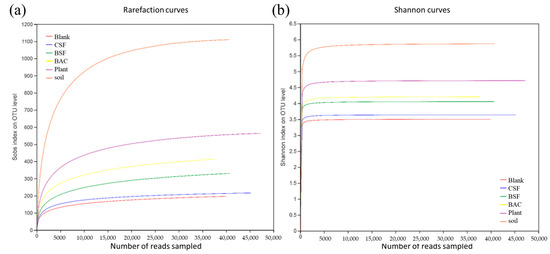 (a) Rarefaction curve; and (b) Shannon index curve.