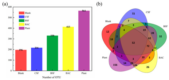 As can be seen from Figure 7a, the number of OTUs in different samples is quite different. The number of OTUs in the CSF group is similar to that in the Blank group, while the number of OTUs in the BSF group, BAC group and Plant group increased significantly compared with the Blank group. These results indicated that the species abundance of the last three groups of sandy soil significantly increased after improvement. In the Venn diagram, similarities and differences between the microbial communities observed in different samples are depicted. As shown in Figure 7b, the total number of OTUs in five samples is 52, and the unique OTUs in Blank, CSF, BSF, BAC and Plant samples were 12, 72, 32, 26 and 156, respectively, accounting for 6.1%, 33.3%, 9.7%, 6.3% and 27.7% of the total number of OTUs in each sample. The number of OTUs shared by BAC and Plant and not shared by other samples was 106, which was quite different from the microbial communities of other samples.