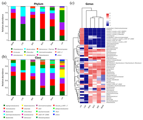 Figure 8a shows the microbial composition of the bacterial community at the phylum level. All samples contain the highest amount of Proteobacteria, ranging from 35.5% to 67.3%. Interestingly, Firmicutes have been found in 44.3% of sand samples improved by BAC. As many Firmicutes can produce spores resistant to dehydration and extreme environments [31], the high abundance of Firmicutes indicates that some microorganisms in the sandy soil treated by BAC had changed to cope with the environment. Another dominant bacterial phylum is Bacteroidetes, which degrades organic matter. Due to the high organic content of raw material for CSF and BAC, Bacteroidetes abundance increased significantly in the treated sandy soil. Further comparative analysis of the microbial community at the phylum level are shown in Figure 8b. All samples were dominated by Actinobacteria and Bacteroidetes at the phylum level. There was a significant difference in the microbial abundance in the samples before and after the sandy soil treatment, with the emergence of Gemmatimonadetes and Saccharomyces that were not present in the Blank samples. The BAC group has the highest percentage of Bacillibacteria, which is a beneficial soil microorganism that can effectively remove soil organic pollutants while also contributing to the restoration of the soil ecology [32]. The top 50 taxonomic genera and five samples were hierarchically clustered using the Bray–Curtis similarity index to analyze microbial community profiles by genus (Figure 8c). As a result of cluster analysis, it was determined that the microbial composition of the sandy samples treated with CSF did not resemble other groups. Representative genera in the CSF group samples were Bosea, Ochrobactrum, Brevundimonas, and Sphingobacterium, while representative genera in the Blank group were Paracoccus, Cellulomonas, and Paenibacillus. However, it seems that the composition of the two samples is relatively similar because 15 of the top 50 genera are shared. As the BAC-treated sand samples were most correlated with the Plant samples, this suggested that vegetation on the treated sandy soil positively contributes to soil development. There is a close relationship between sandy soil samples modified by BSF and sandy soil samples modified by BAC, since the BAC material is formed by adding biological mycelia to the CSF material.