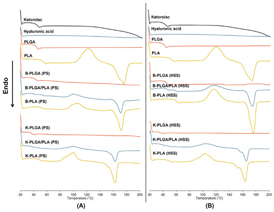 Differential scanning calorimetry thermograms of blank (B-PLGA, B-PLGA/PLA, and B-PLA) and ketorolac-loaded microparticles (K-PLGA, K-PLGA/PLA, and K-PLA) prepared by PS (A) and HSS (B) techniques.