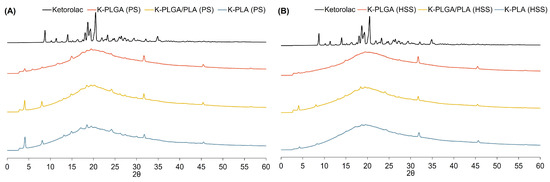 X-ray diffractograms of ketorolac-loaded microparticles (K-PLGA, K-PLGA/PLA, and K-PLA) prepared by PS (A) and HSS (B) methods.