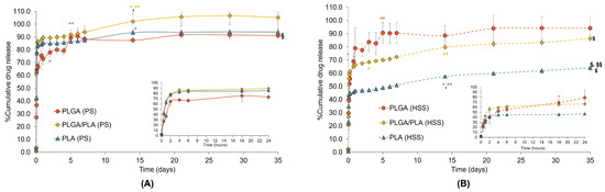 The cumulative release profiles of ketorolac from ketorolac-loaded microparticles prepared by PS (A) and HSS (B) methods in PBS, pH 7.4, over 35 days (mean ± SD, n = 3). An inset represents the release profiles within 24 h. Solid lines and dotted lines represent the drug release from the microparticles prepared by PS and HSS techniques, respectively. *, ** Significantly different when comparing %cumulative drug release at the time forward with 4 and 24 h, respectively; § significantly different when comparing the release profile with that of PLGA/PLA microparticles prepared by the same technique; §§ significantly different when comparing the release profile with that of PLGA microparticles prepared by the same technique; $ significantly different when comparing the release profiles of the similar component microparticles prepared by PS and HSS techniques.