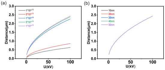 Figure 2 shows variation in the of a single carbon black particle with the obtained by MATLAB R2019a simulation. In Figure 2a, is fixed at 10 nm, and the accelerating voltage goes from 10 kV to 50 kV. As increases, the total penetration depth increases first, then tends to take a constant value when reaches a threshold. The accelerating voltage during implantation only affects the constant value and has no effect on the change trend, which is consistent with the trend shown in Figure 2a. As the implantation dose increases in Figure 2a, the X-U curve shows signs of superposition, which also indicates that increasing the implantation dose has no effect on the total penetration depth when the implantation dose reaches a certain threshold. In Figure 2b, the accelerating voltage is fixed at 40 kV, and varies from 10 nm to 50 nm. The conclusion is consistent with Figure 2a.