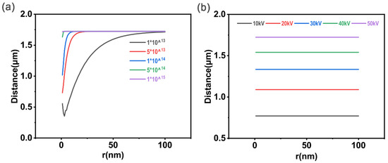 We investigated the effect of carbon black particle size on the total penetration depth, , of a single carbon black particle. In Figure 3a, the accelerating voltage was 40 kV, and the implantation dose was ions/cm2. When the implantation dose was ions/cm2, the total penetration depth, , was tremendously affected by , increasing with and then finally tending to become stable. When the dose was ions/cm2, the total penetration depth, , remained constant, indicating that hardly had any effect on it. Therefore, it can be concluded that has nearly no effect on the total penetration depth, , when is large enough. In Figure 3b, the implantation dose was constant at ions/cm2, and the accelerating voltage varied from 10 kV to 50 kV. The X-r curve is approximately a straight line parallel to the X-axis, which is consistent with the conclusion obtained with respect to the left figure, that is to say, has no influence on under such conditions.