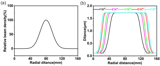 In the model establishment and the MATLAB R2019a simulation of Section 2.1, it was assumed that the ion beam is uniform, but the beam density cannot be uniform in the actual implantation process. According to measurement results reported in the literature [42,43], it can be known that the distribution follows Gauss’s law, which means that the density in the middle part is the highest and that the density decreases towards the two side parts. The target of ion implantation was a disk with a diameter of 16 cm, so a probe into the influence of the inhomogeneity of the beam density was needed. We quoted the measurement results of Zhu [44] and then used MATLAB for fitting to obtain the beam density distribution function with an arbitrary radial distance, as shown in Figure 4a.
