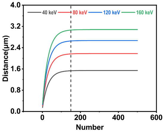 The energy levels of silver ions before each collision with carbon black particles in Equation (30) are different from the levels in Equation (29), which were, randomly, either 40 keV, 80 keV, 120 keV, or 160 keV. Therefore, we could first calculate the occurrent number of silver ions with different energies among the 150 silver ions and the probability at the time and then calculate the maximum total penetration distance under different conditions. We ignored the silver ions with 160 keV in our calculation because their numbers were too low. Since the probability of the initial energy of a single silver ion was fixed, we could use a multinomial distribution to calculate this event. The initial energy of each silver ion colliding with a carbon black particle might have three possible outcomes, , , or . ( represents 40 keV, represents 80 keV, and represents 120 keV). Their probabilities are , , and (, , ), respectively. In the results for the total sampling of 150 times, the probability of occurrence of times for , times for , and times for is: