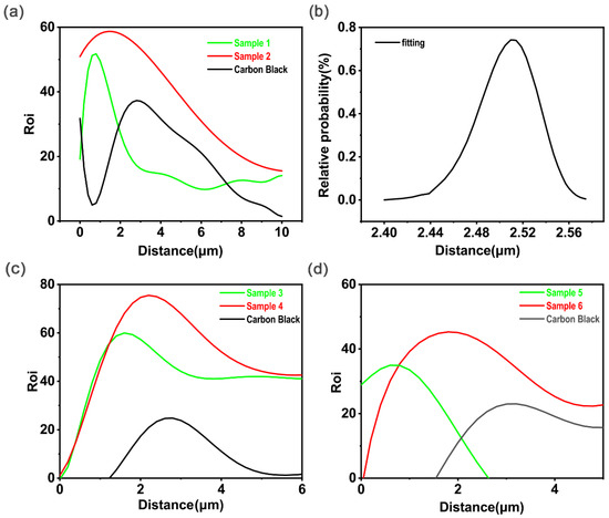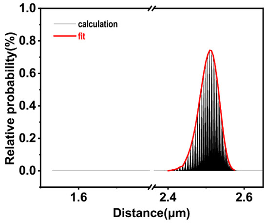We arranged the data in fifth and sixth columns in Table 2 according to the data in the fifth column from smallest to largest, as represented by the black curve in Figure 6. The horizontal axis represents the total penetration depth of a single carbon black particle, while the vertical axis represents the corresponding probability. Figure 6 shows the probability distribution for the penetration depth of a single carbon black particle, and the red curve shows the result after fitting. It can be found that when the radius was 5 nm, the probability distribution of the penetration depth of a single carbon black particle followed a Gaussian-like distribution.