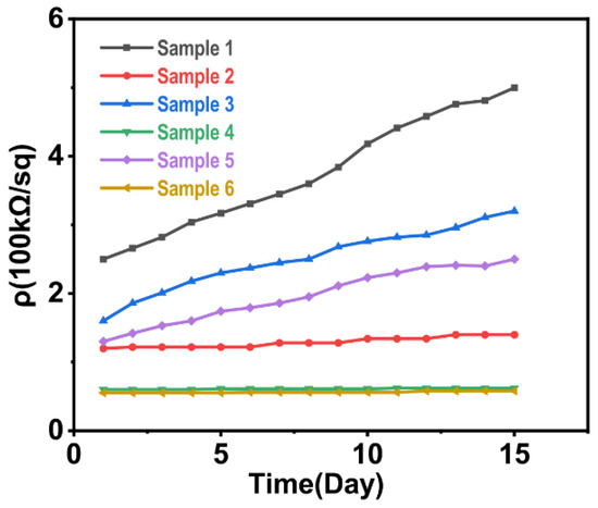 Samples 1, 3, and 5 consisted of PDMS implanted directly with silver ions with energies of 30 , 40 and 50 , and samples 2, 4, and 6 consisted of PDMS coated with carbon black initially followed by implantation with silver ions with energies of 30 , 40 and 50 . After implantation, there was a distinct silver film on the surface of sample 1. The surface conductivity of sample 1 was 251.85 kΩ per square, which was 10 orders of magnitude lower than the original sample, indicating that there was a conductive layer on the surface. To verify the stability of the conductive layer, the resistivity of the fixed point of the sample was measured at a fixed time, daily, for 15 days. It can be seen from Figure 7 that the resistivity increased with time. The samples with implantation energies of 40 and 50 showed the same pattern.