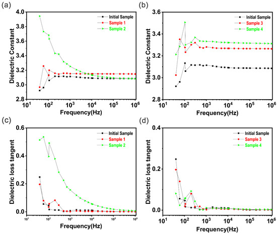 (a,c) The dielectric constant and dielectric loss test for the original sample and samples 1 and 2 at different frequencies. (b,d) The dielectric constant and dielectric loss test for the original sample and samples 3 and 4 at different frequencies.