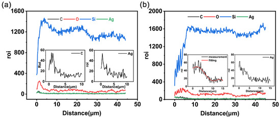 It can be seen from Figure 11a that the concentration of silver ions at a depth of 5 microns first increased and then decreased. Figure 11b shows the energy spectrum of a cross section of sample 4, in which the change trend for silver ions was the same as that in Figure 11a within 2.5 microns. The distance became smaller due to the hindering effect of carbon black particles, resulting in a decrease in the depth at which silver ions entered and a faster downward trend than in the left figure.