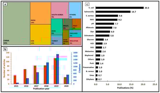 An overview of publications on food spoilage during 2015–2020 in relevance to (a) countries, (b) publication year, and (c) analytes. Reprinted with permission from ref. [].