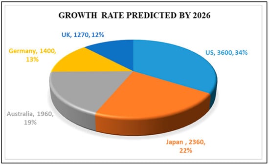 Active systems can be used successfully to extend the shelf life of processed foods, and can be divided into adsorbent and releasing systems (e.g., oxygen scavengers, ethylene scavengers, liquid and moisture absorbers, taste and odour absorbers or releasers, antimicrobials, etc [,,,,]. On the other hand, smart packaging can monitor the condition of the packaged food or the environment by providing information on various factors during transportation and storage, including time-temperature indicators, gas detectors (volatile organic compounds (VOCs) and gas molecules like H2, CO, NO2, O2, NH3, etc.) and freshness and/or ripeness indicators. Although active packaging attracted interest in Japan as early as the 1970s, it gained significant attention in European markets in the 1990s. The future of global active packaging markets through 2026 is shown in Figure 3 []. In light of these developments, eco-innovative and functional food packaging materials are fast becoming a strategic target for the European food sector and market.
