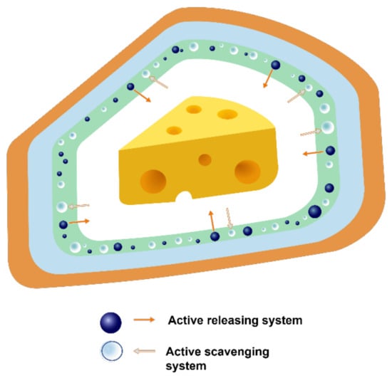 Active packaging is an evolving technology used to retain the quality of food. According to European Regulation, active materials are those components that are introduced intentionally into/onto the packaging to extend the shelf life or maintain or improve the condition of the packaged food, and are purportedly designed to release or absorb substances into or out of the packaged food or the environment surrounding the food []. They can also act without being released on the surface if they come into contact with the food at the interface. Since this technology omits the stage of adding anything directly into the food, it is convenient and satisfactory from both the manufacturer’s and consumer’s perspectives. Active packaging films have been employed successfully in the packaging of food products such as meat and fish products, dairy products, vegetables, bread and bakery products, etc., [].