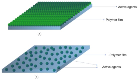 Schematic representation of active agents coated (a) and integrated into bulk of polymer films (b).